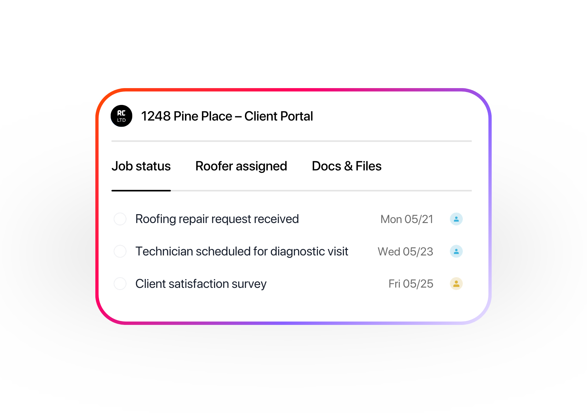 Give each customer their own private client portal where they can see job status, job files or photos, and more. Plus, they can contact you easily.