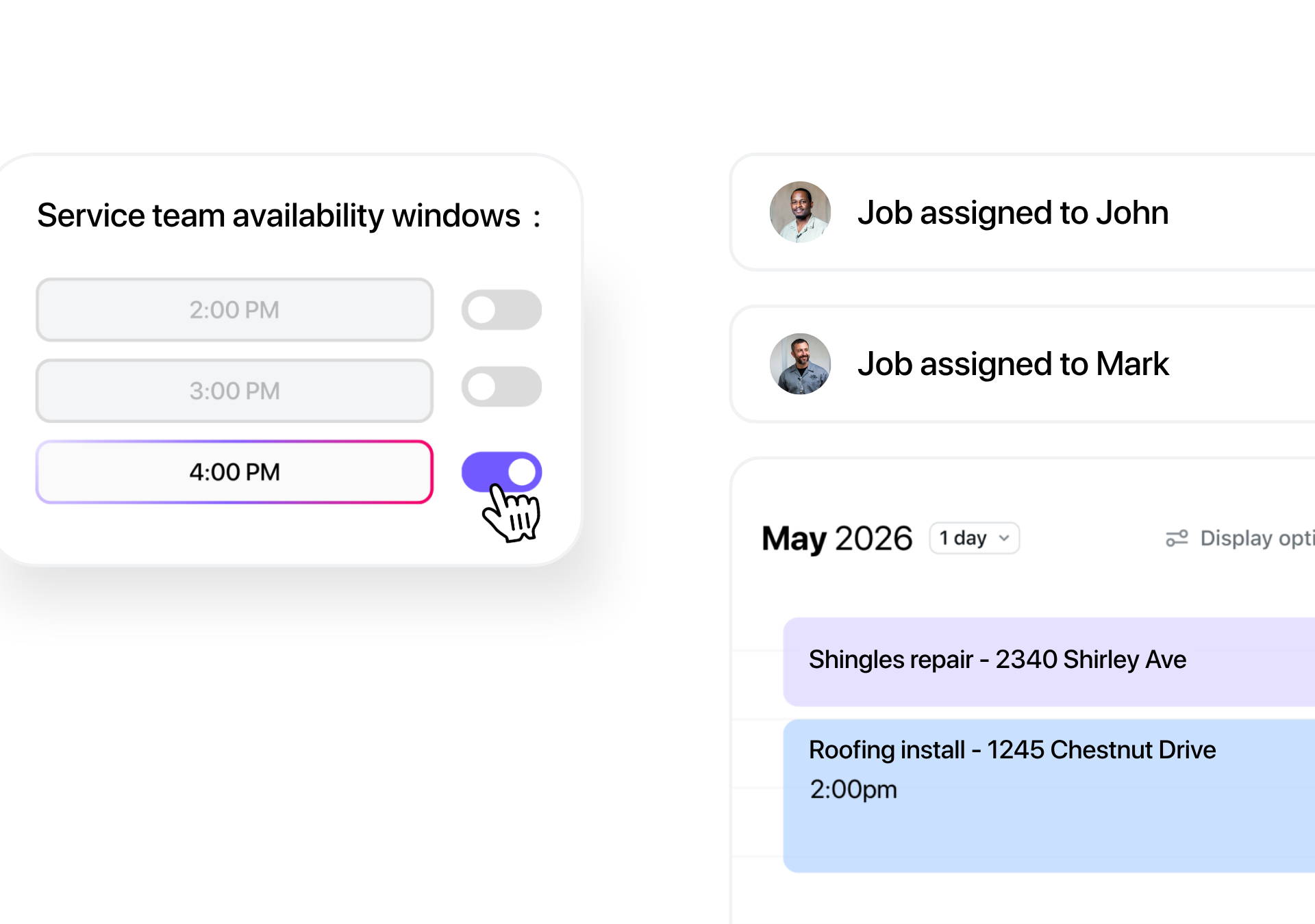 Wonderly works for solo operators and teams. Add your technicians, assign jobs, and everyone sees the schedule. Round-robin booking distributes leads fairly.
