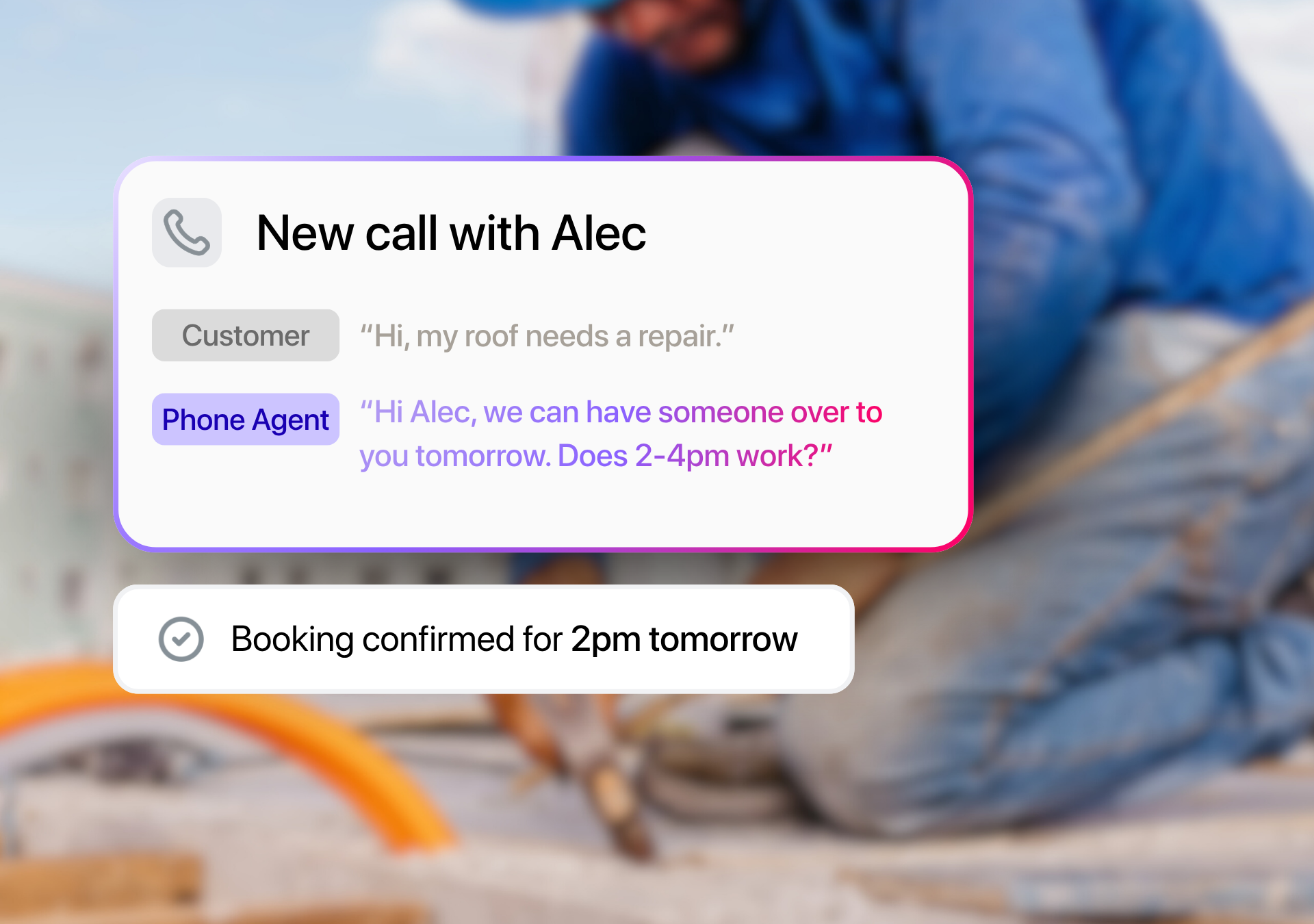 The AI agent picks up when you’re unavailable. It answers questions, books appointments, and routes calls to you when leads or customers ask for a human.