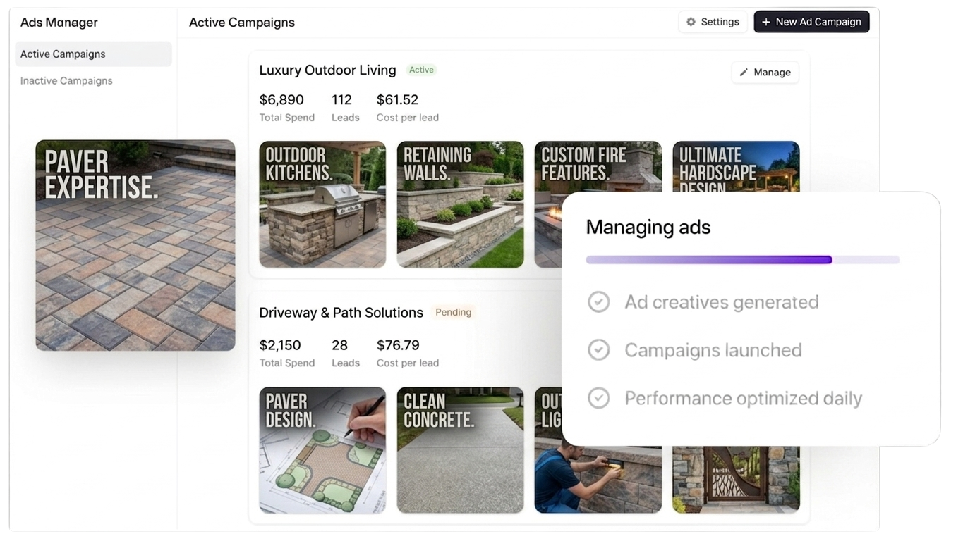 Facebook ads work for hardscape contractors, but Ads Manager was built for marketing agencies — not someone coordinating crews and material deliveries. Wonderly builds your ads for you, writes the copy, creates the imagery, and manages the campaigns so homeowners planning paver patios and retaining walls find you instead of scrolling past another boosted post.