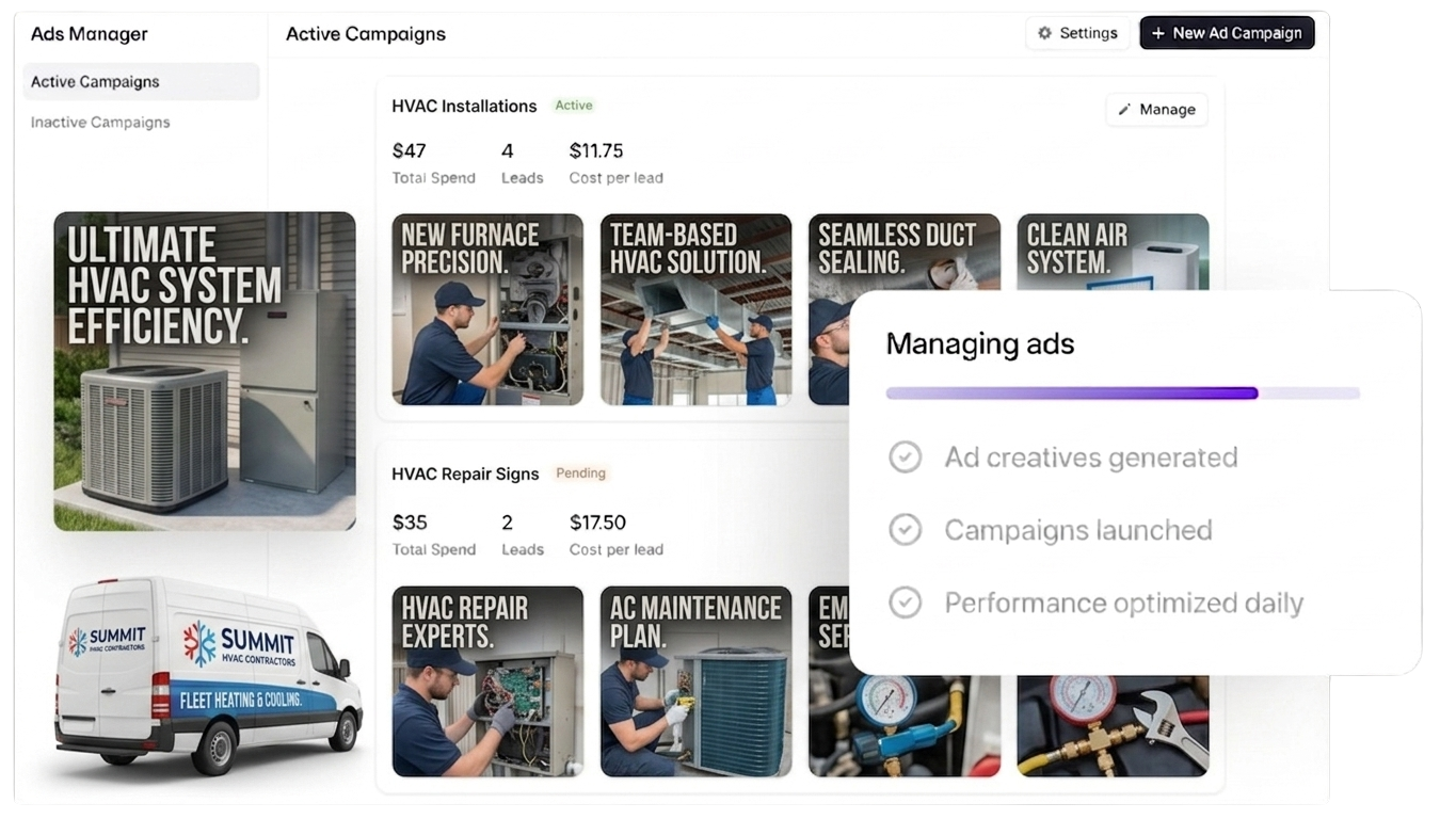 Facebook ads work for HVAC contractors, but Meta wasn't built for someone running service calls at 7 a.m. Wonderly builds the ads for you — writes the copy, creates the imagery, launches the campaigns — so you can focus on installs while homeowners and property managers ready to replace their systems find you.