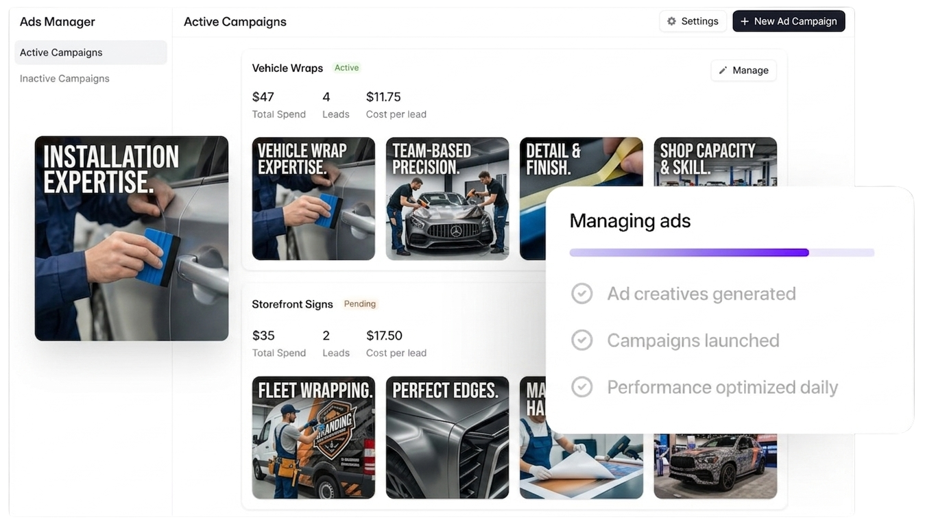 Facebook ads work for lawn care, but Ads Manager wasn't built for someone running routes all day. Wonderly builds the campaigns for you — writes the copy, creates the imagery, tunes the targeting — so you get homeowners booking recurring maintenance and seasonal packages, not likes from other contractors.