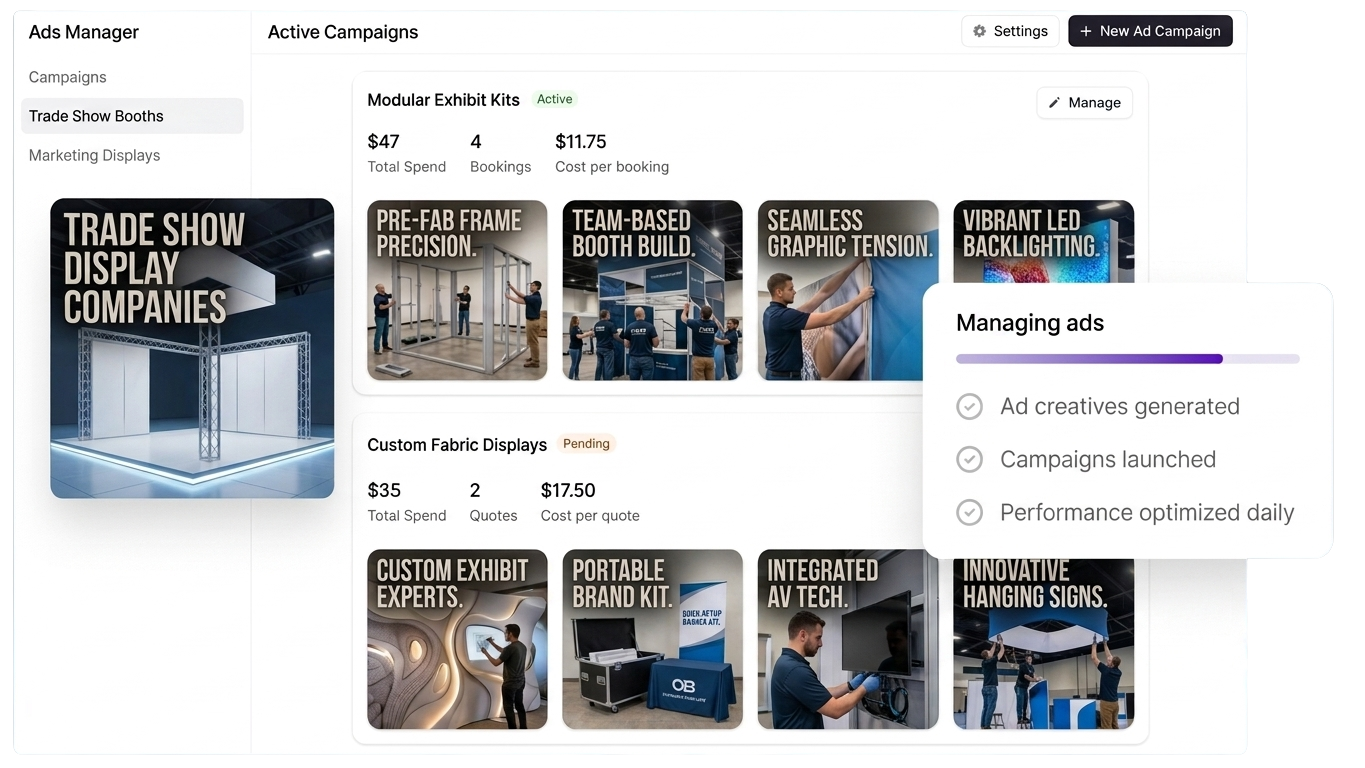 Facebook ads work for trade show display companies, but Meta wasn't built for someone coordinating I&D schedules and fabrication timelines. Wonderly builds the ads for you — writes the copy, creates the imagery, manages the campaigns — so you reach corporate event managers planning spring and fall shows, not other vendors liking your posts.