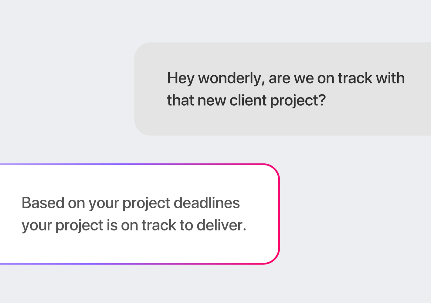 Ask Wonderly's AI anything — customer details, project status, what was discussed in a meeting — and get instant answers. Respond to clients faster and never miss important details.