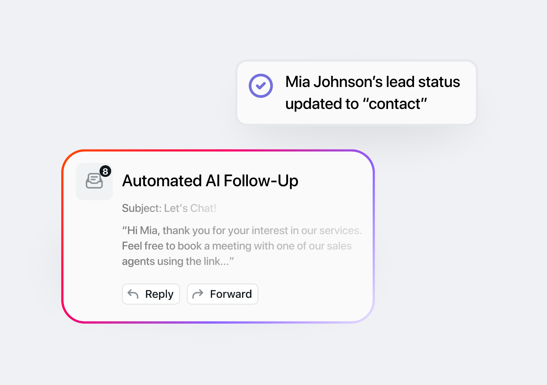 Instant follow-up: Qualified leads hear from you in seconds — email, text, and AI phone call. Before they've even closed the tab.