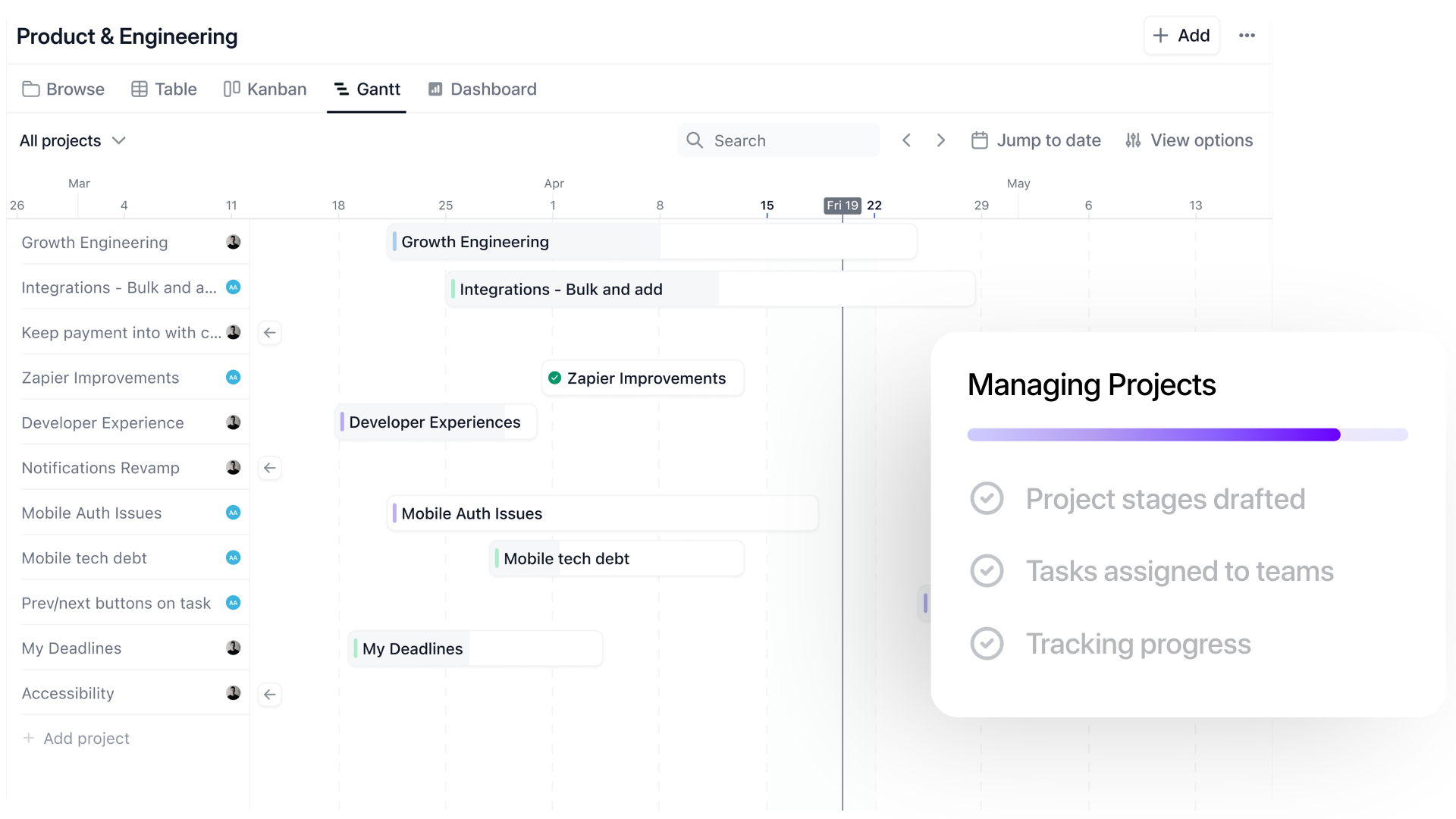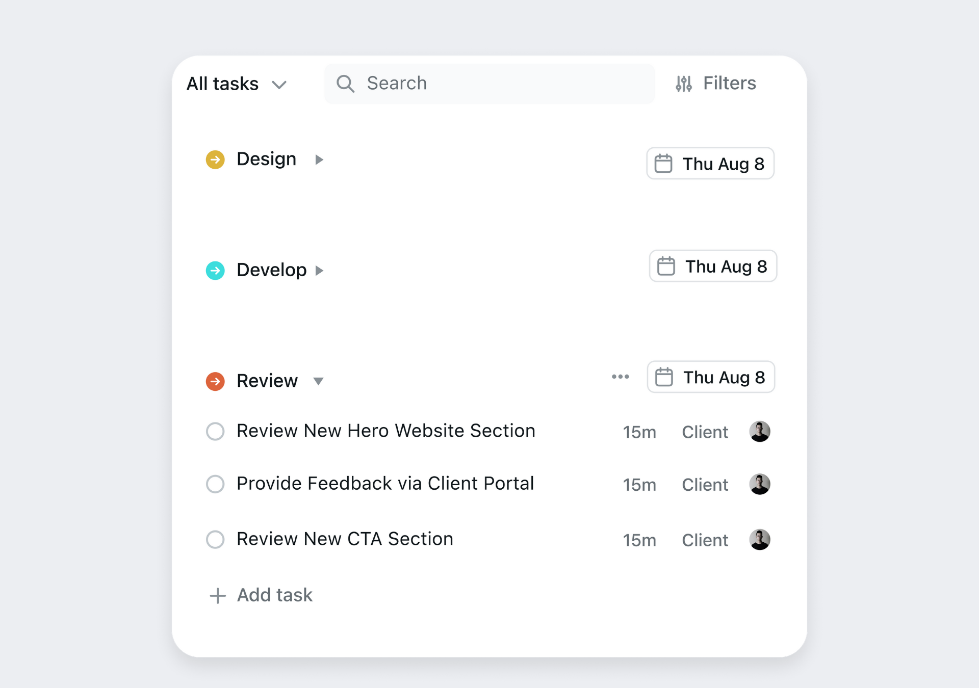 See your entire project timeline at a glance. Visualize task dependencies, spot scheduling conflicts, and adjust deadlines with drag-and-drop. So you can plan better and keep clients informed about realistic delivery dates.