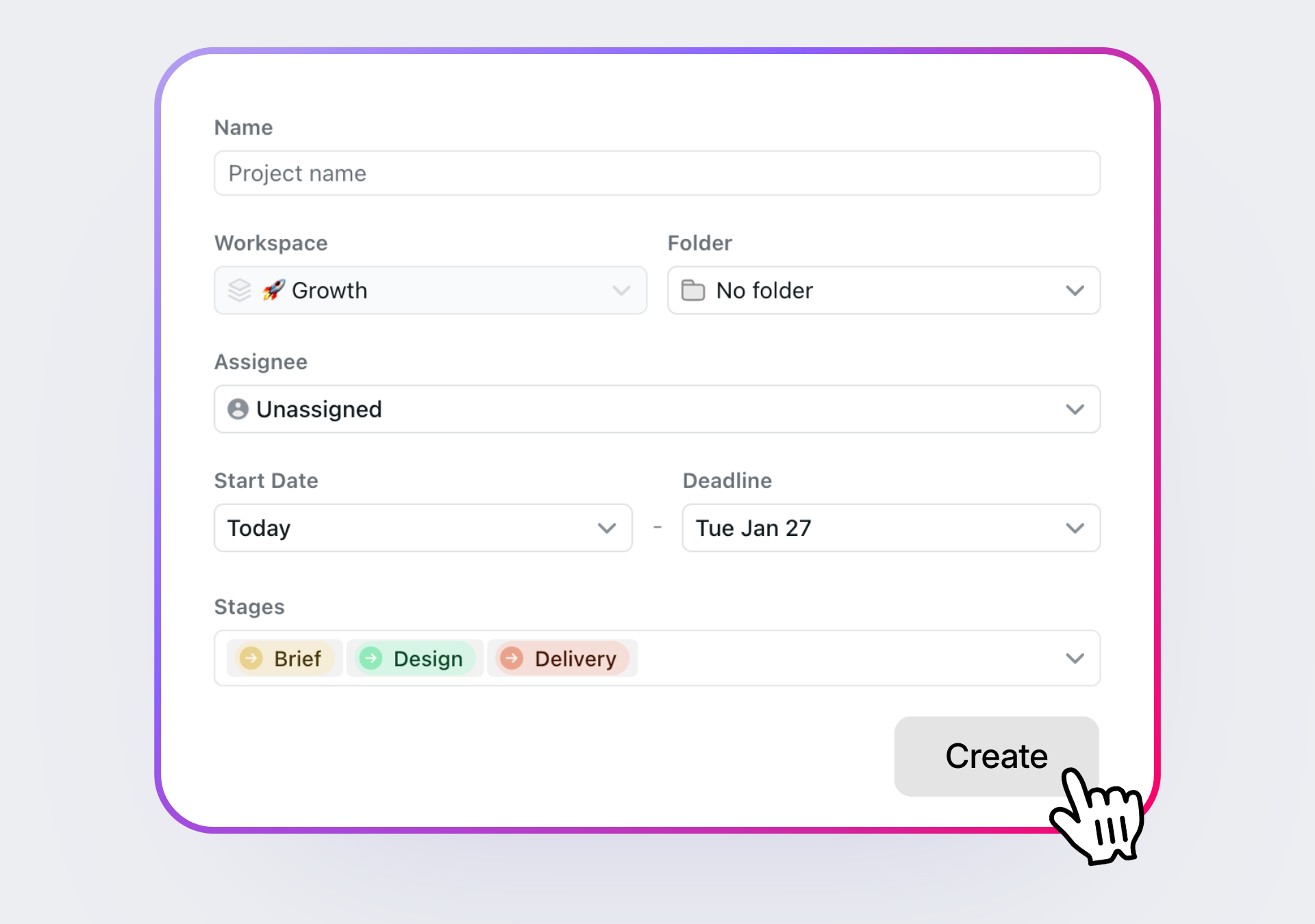Save any successful project as a reusable template. Every new client gets the same approach that delivered great results before—ensuring consistency and quality.