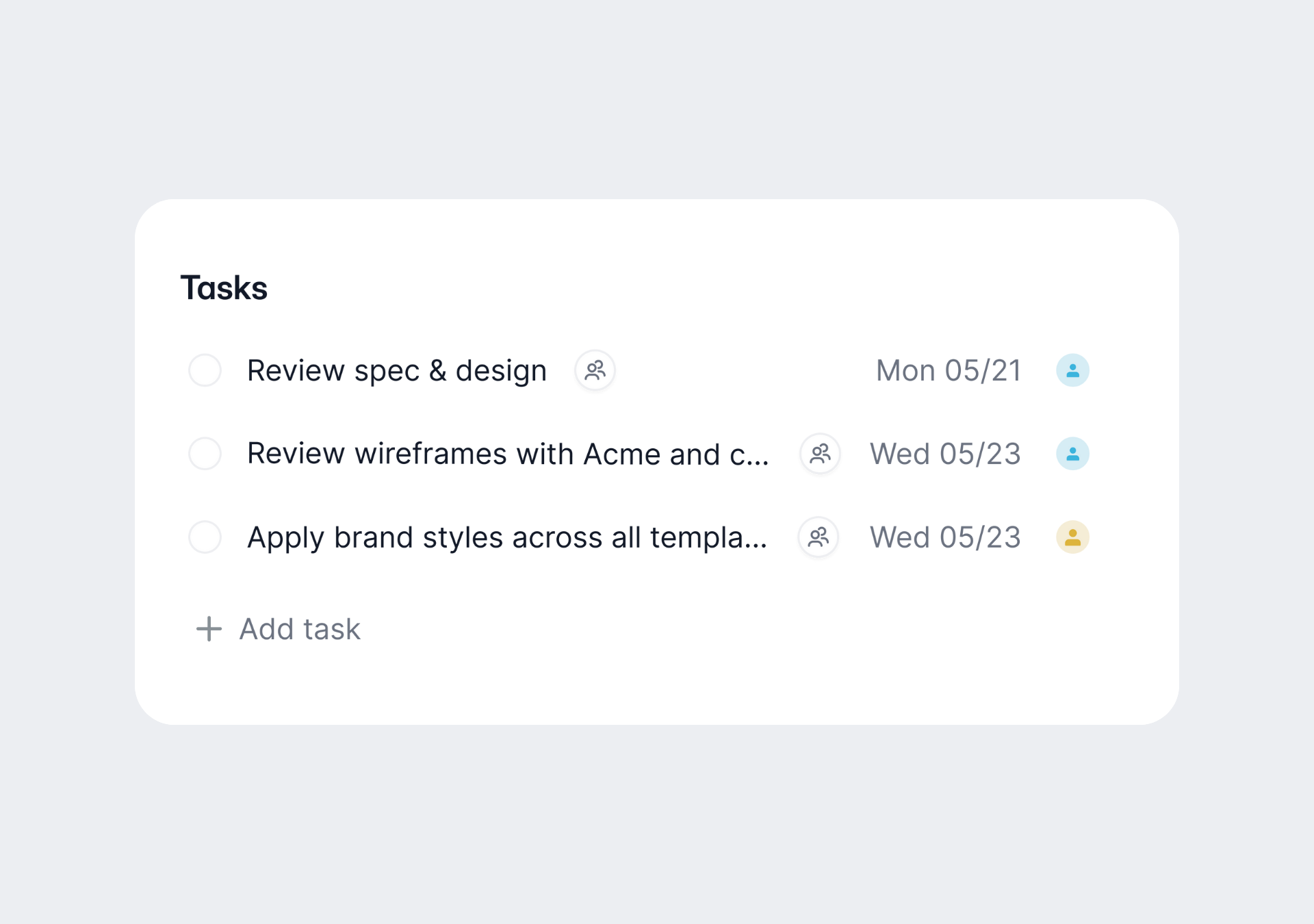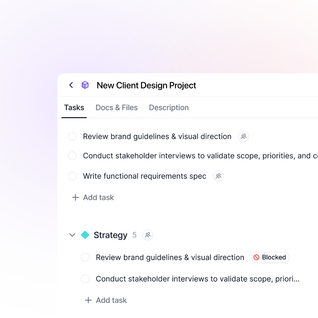 Open any client record and see all their work — tasks, deadlines, deliverables. No more "who is this task for?" No more digging through different software platforms for info.