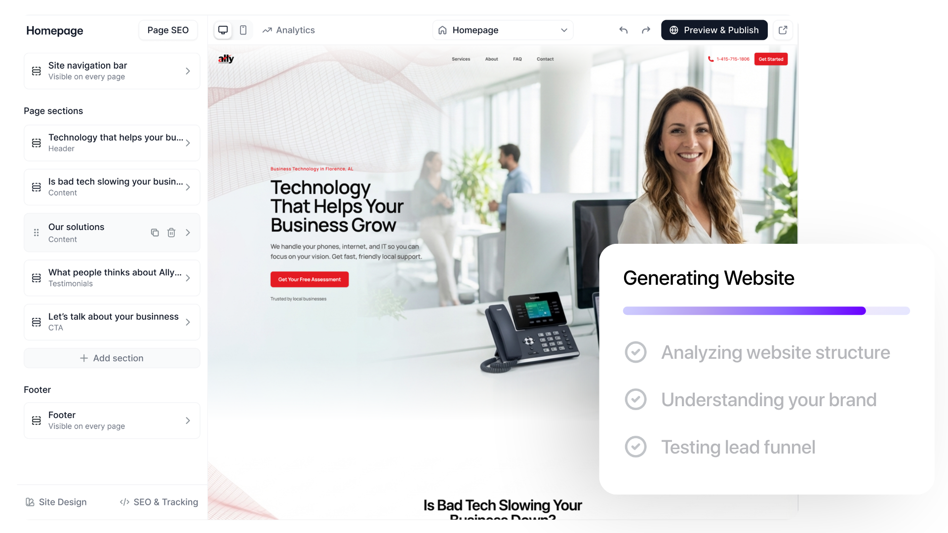 Review and customize your site — if you want. Drag, drop, edit, rearrange. No code needed. The strategic foundation is already built. You're just fine-tuning.