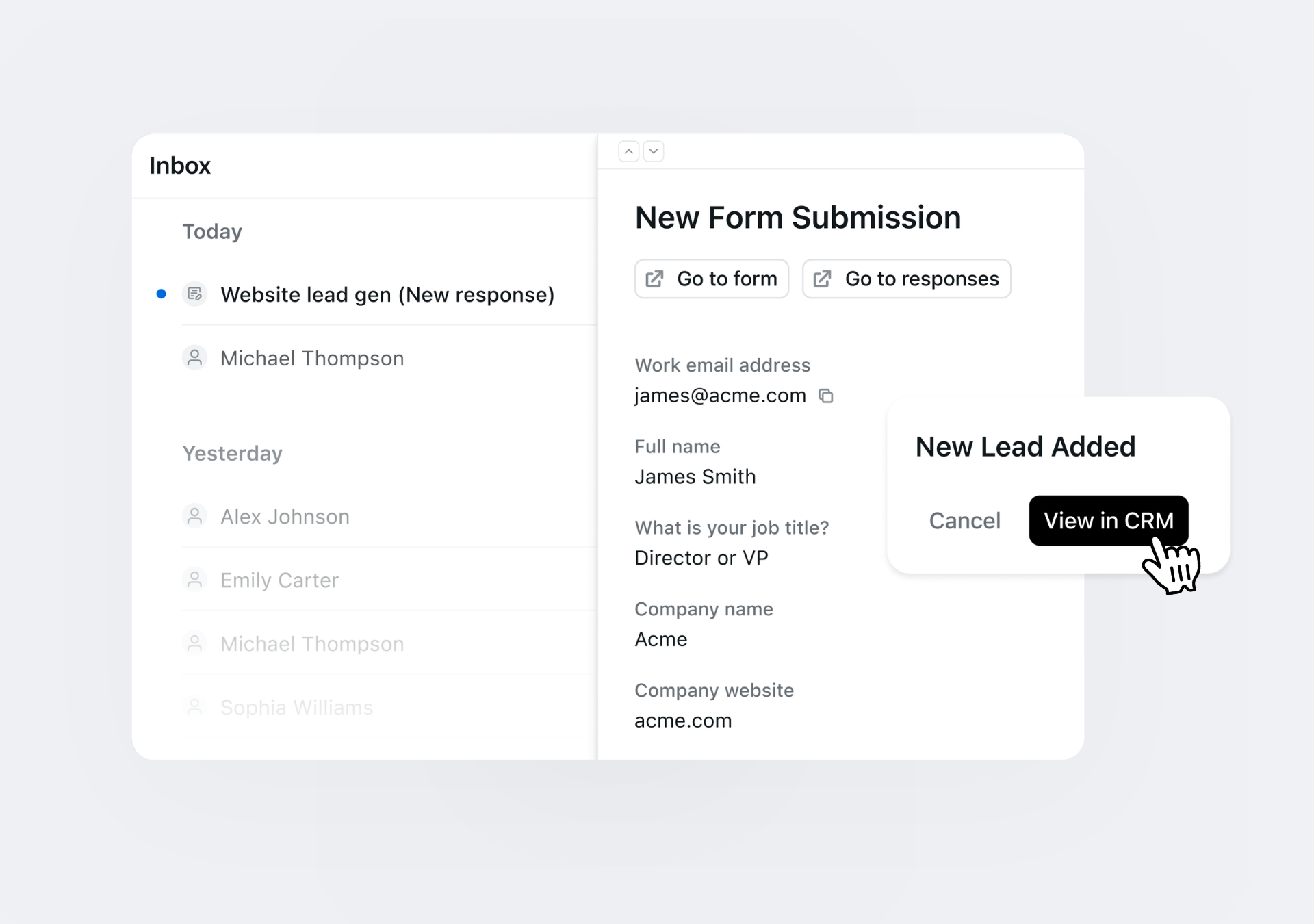 Customizable forms that connect to your CRM inside Wonderly automatically.