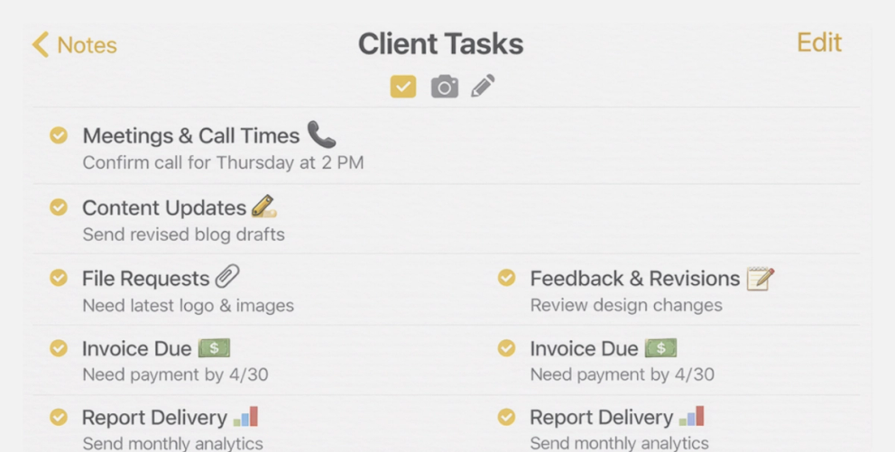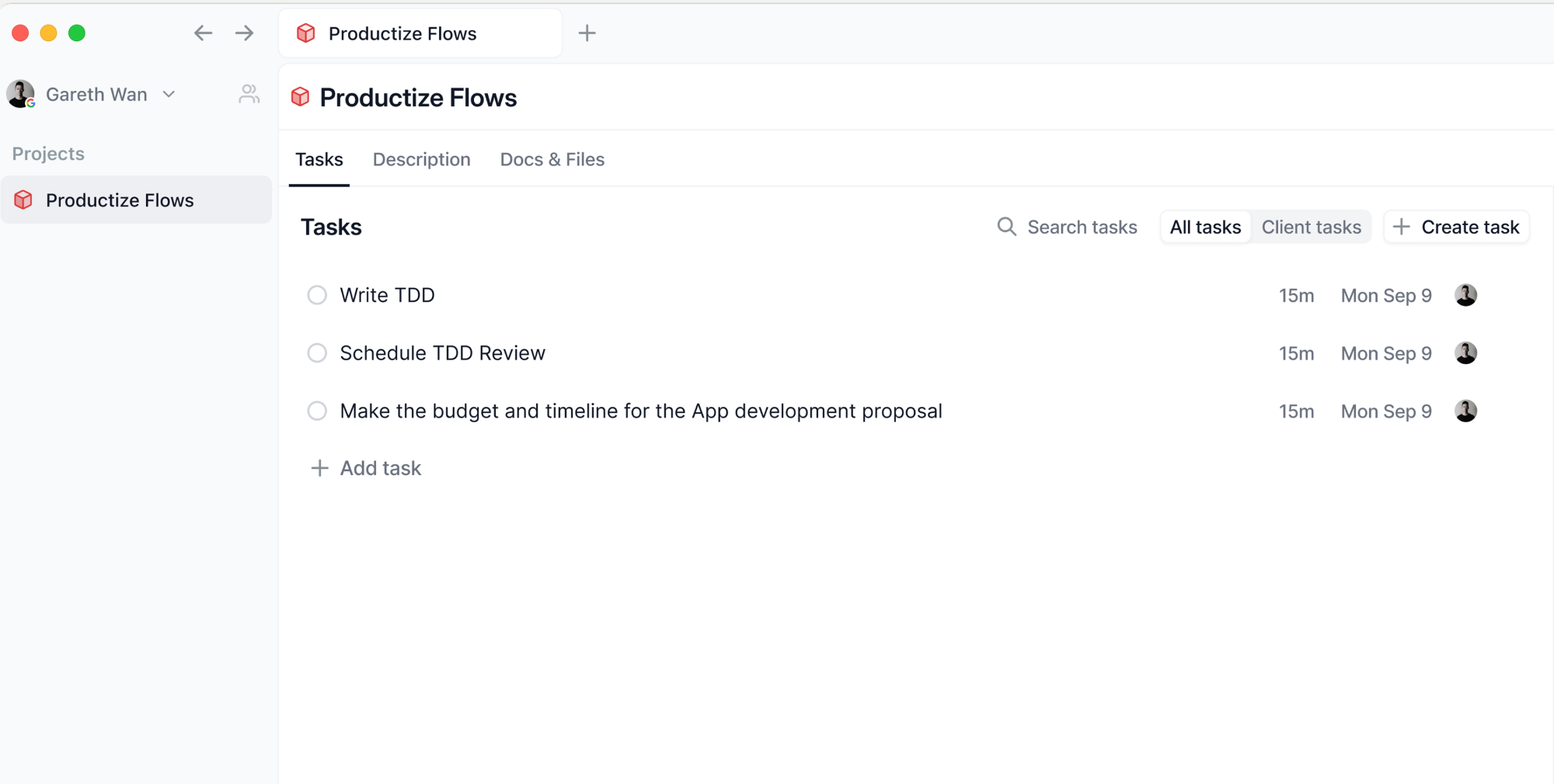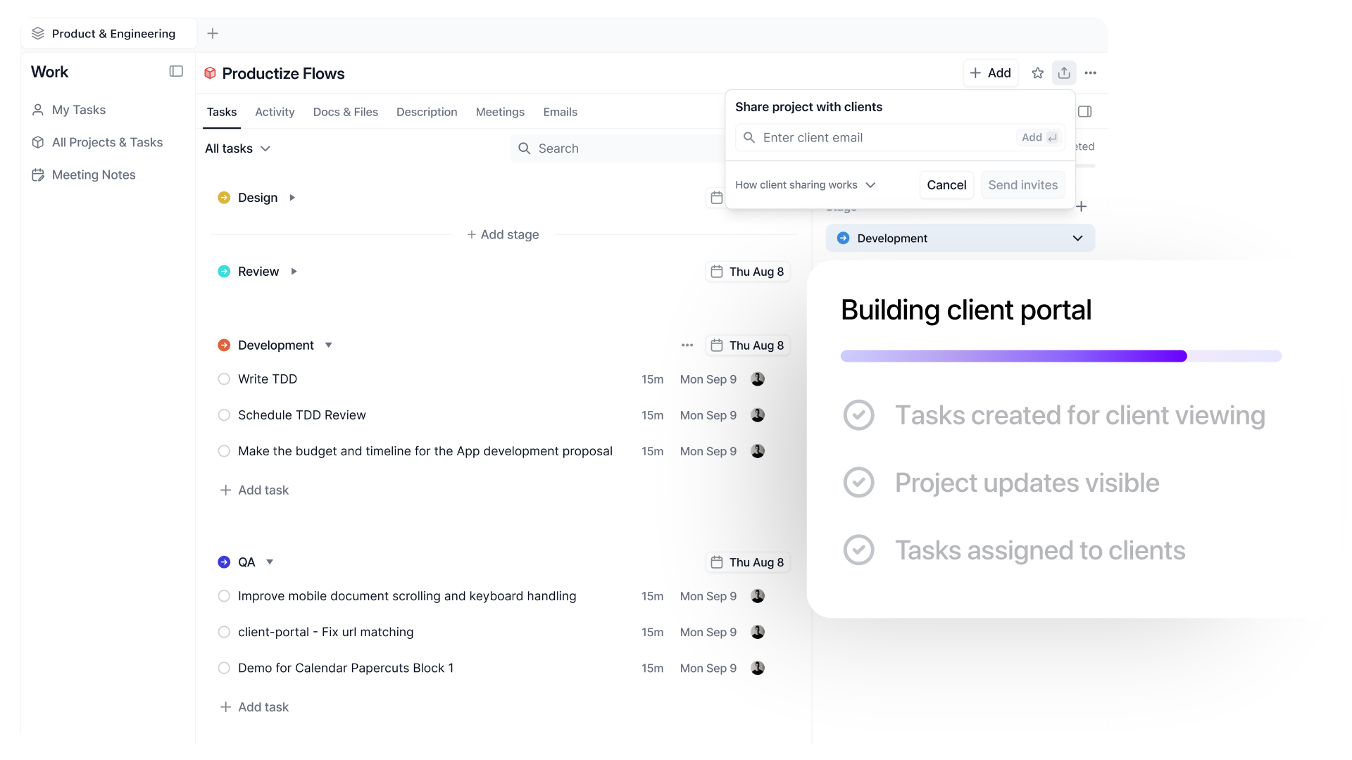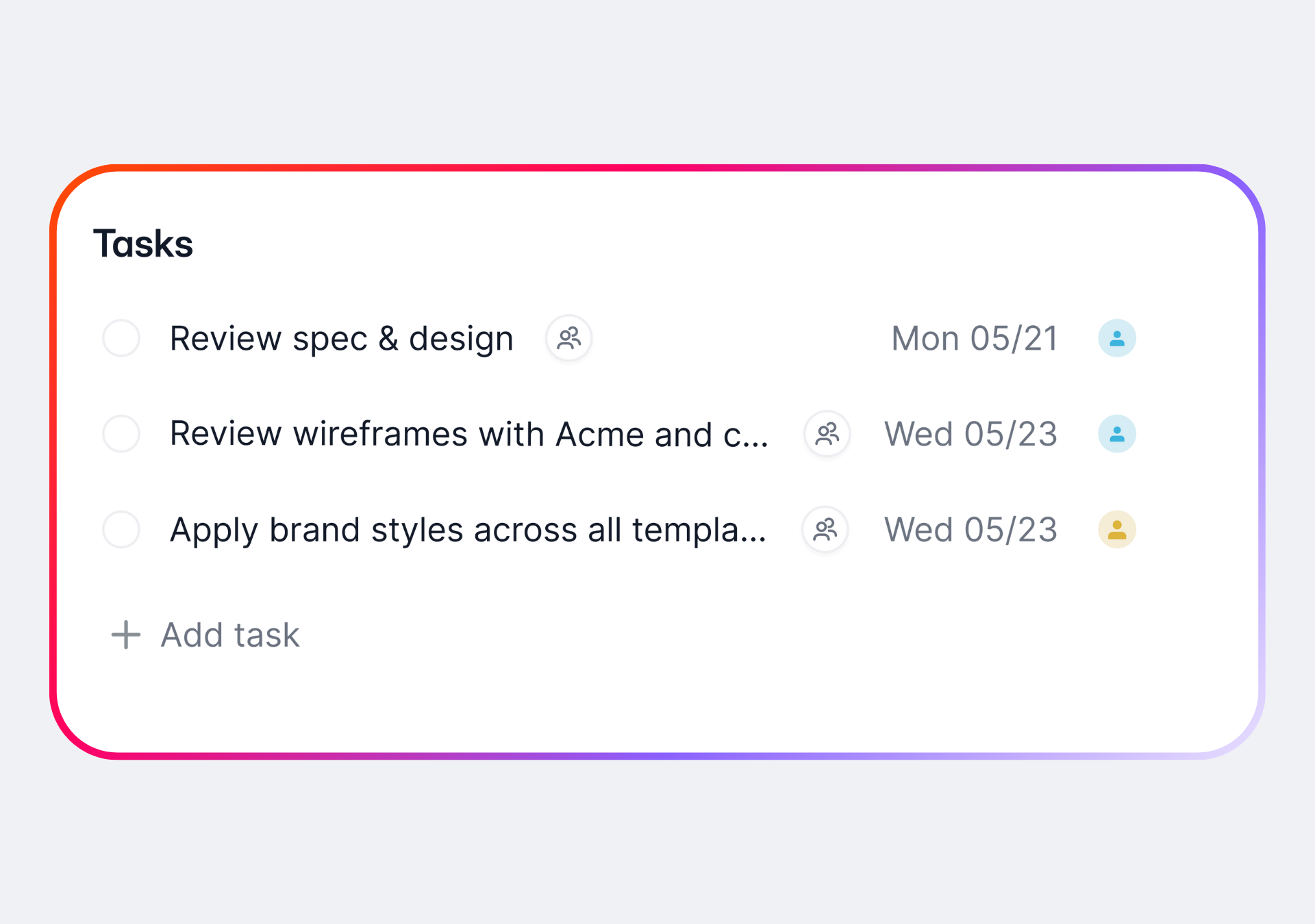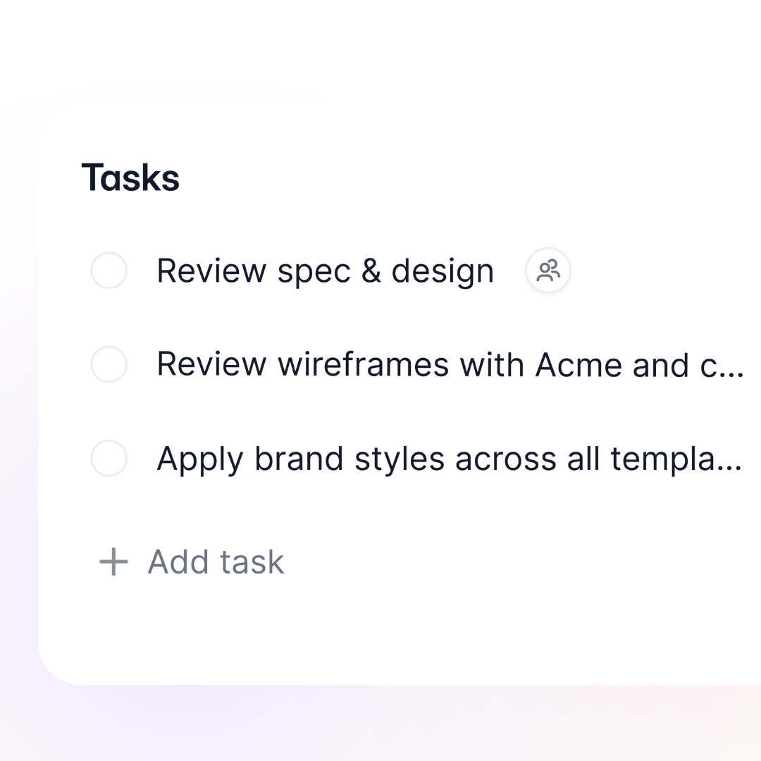 Clients see their project status, completed tasks, and what's coming next. So they never feel out of the loop.
