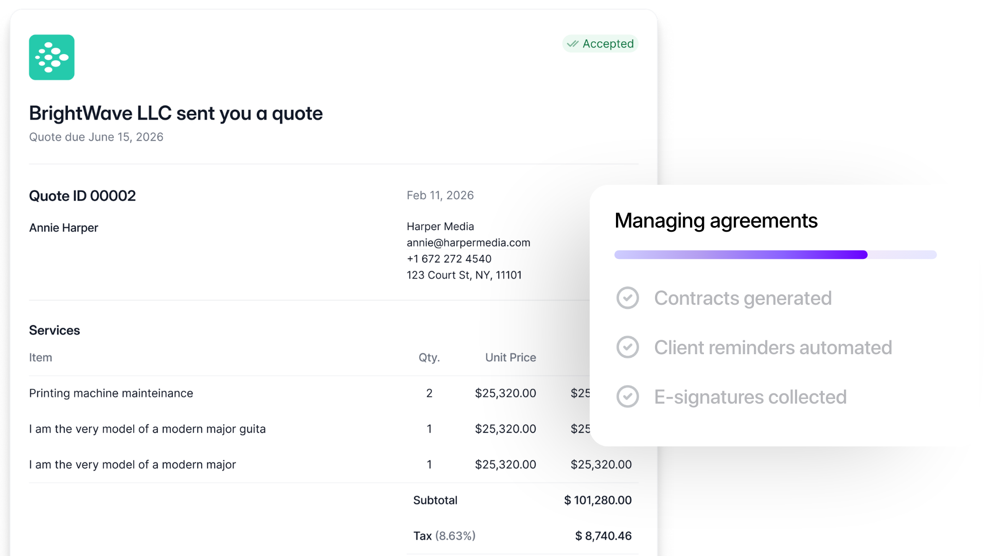 Quote and e-signature features that save time and money.