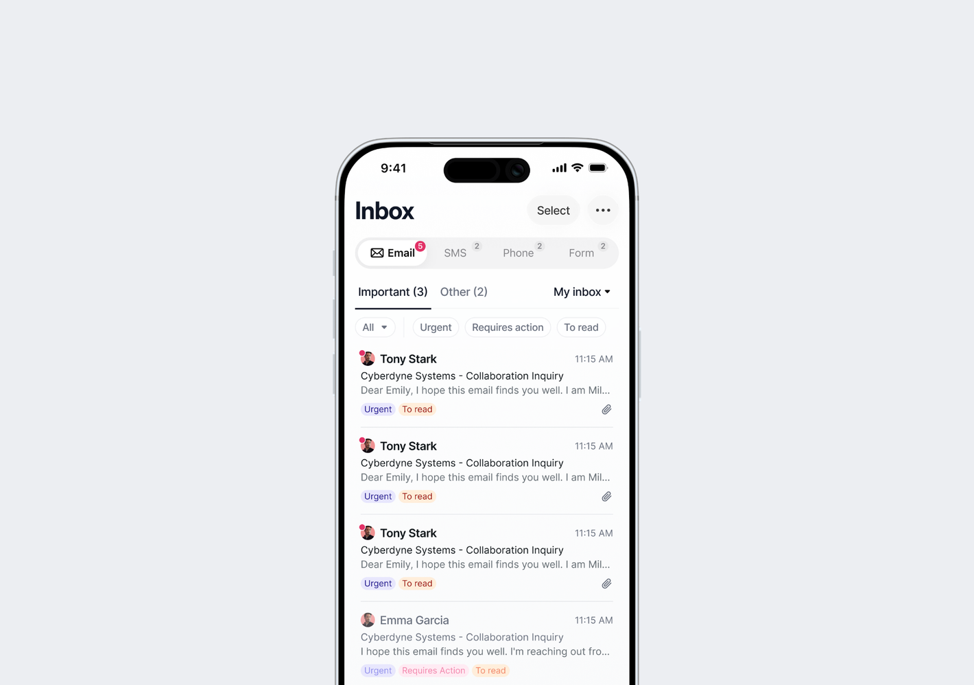 A unified inbox combines all of your communication channels — email, text, calls, and project notifications — into one place. Instead of checking multiple apps throughout the day, you see everything in a single view.